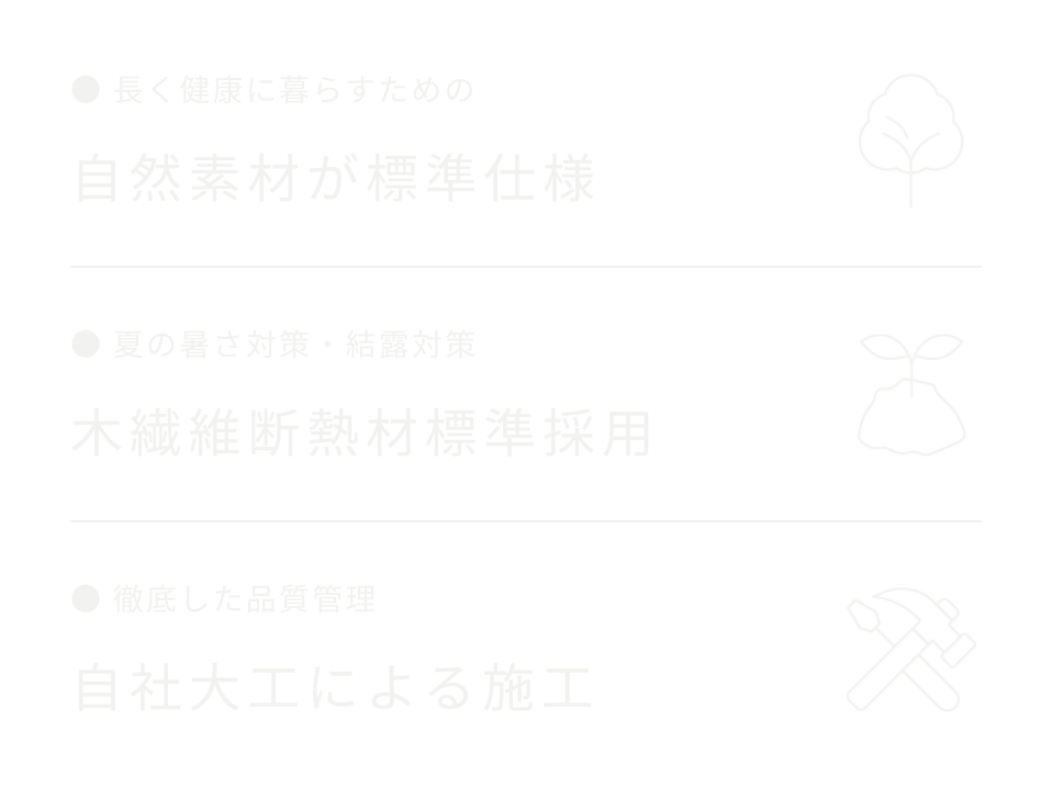 私たちが提案する建築は、注文住宅やリフォーム、地域の施設等どんな建築であっても、普遍的なデザイン・快適に過ごせる性能・安心して暮らせる構造・長く愛着を深めながら使う自然素材や無垢の木、これらすべてを調和させて、ありのままの心と身体で暮らせるものをお届けしています。