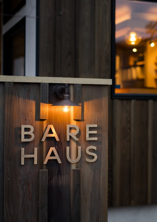 BARE HAUSは滋賀県長浜市内保町にある、つかした建築の標準的な断熱性能(UA値0.32〜0.37前後)や板張り外壁の変化、無垢床、漆喰、紙クロスなどの空気感や素材感を感じていただけるショールームです。サウナを併設した昼間はカフェ、夜はカフェバーになる地域のためのお店でもあり、気軽に私たちの建築に触れていただくことができる場所となっています。