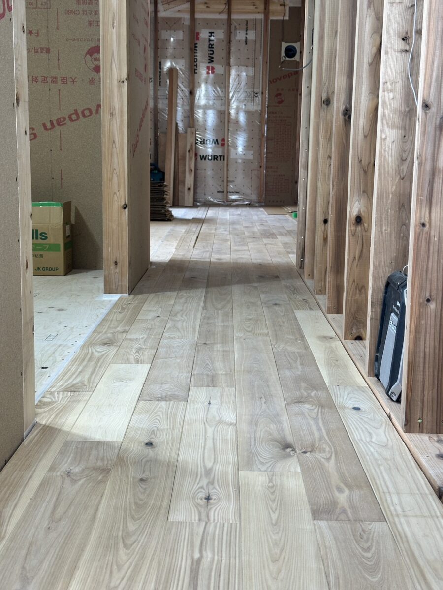 内部では断熱気密工事が終わり北海道産タモの床材を施工中です。やはり無垢の床は足触りが良いです。1枚ずつ表情が違うのでバランス見ながら張っていきます。