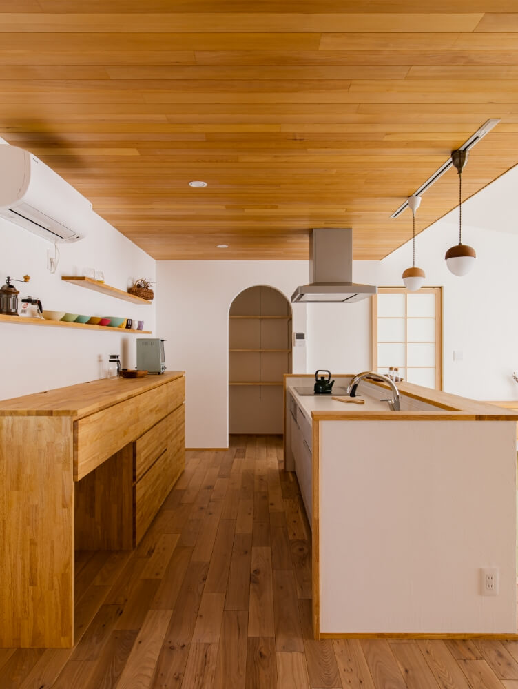 内装の仕上げにも国産木材は欠かすことができません。室内に占める木材の割合を高くすると、リラックス効果や集中力向上・睡眠の質の向上・快適な室内環境・健康への良い影響など様々なメリットがあります。ただ、木の印象が強くなるとデザイン性に好みが偏るため、シンプルな設計・意匠性(デザイン)も優先しながら採用します。