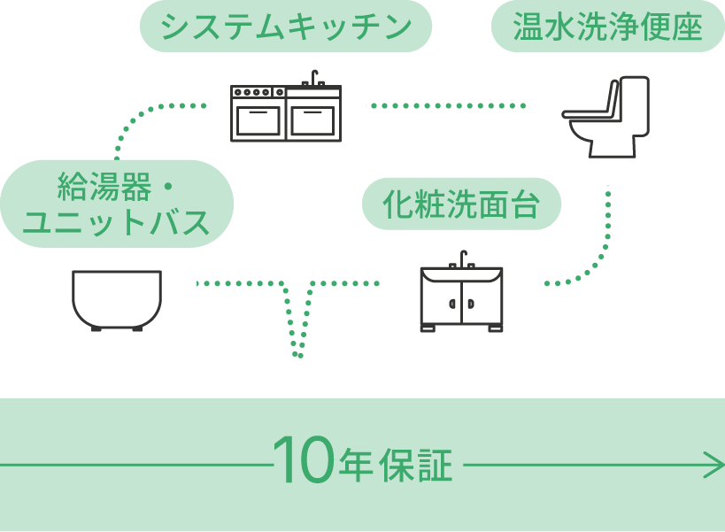 様々なメーカーの住宅設備は、通常メーカー保証として1年程度の保証がございます。設備機器(給湯器・システムキッチン・システムバス・洗面化粧台・温水洗浄便座2台まで)については10年間で起きたトラブルは特例を除き基本的に修理サポートいたします。