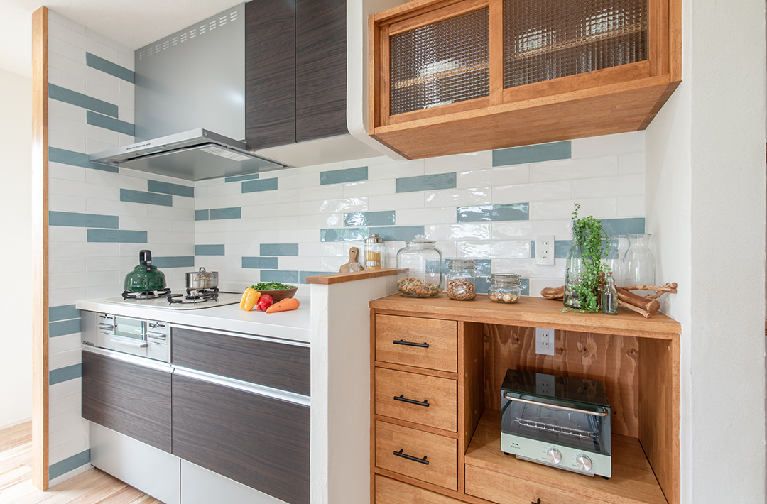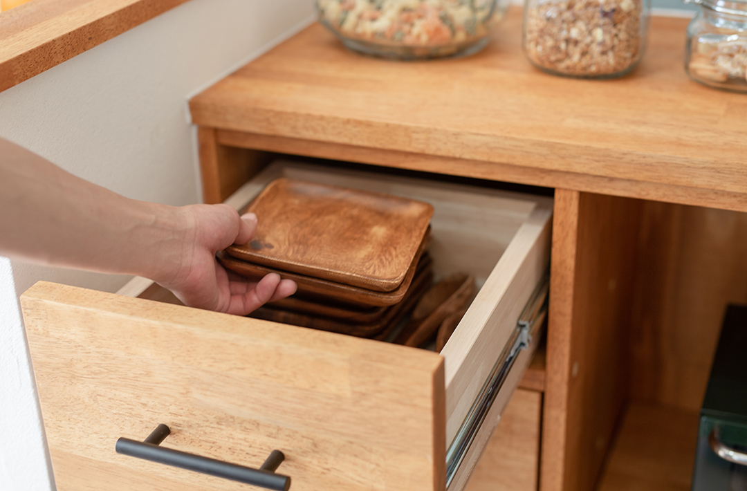 サイズ感を少し落としたアイランドキッチンでは、しっかりとした収納を諦めることなく叶えてくれるだけでなく、リビング対面で洗い物などができるので、ご飯を食べた後に子どもの様子を見ながら家事をすることができるので安心ですね。