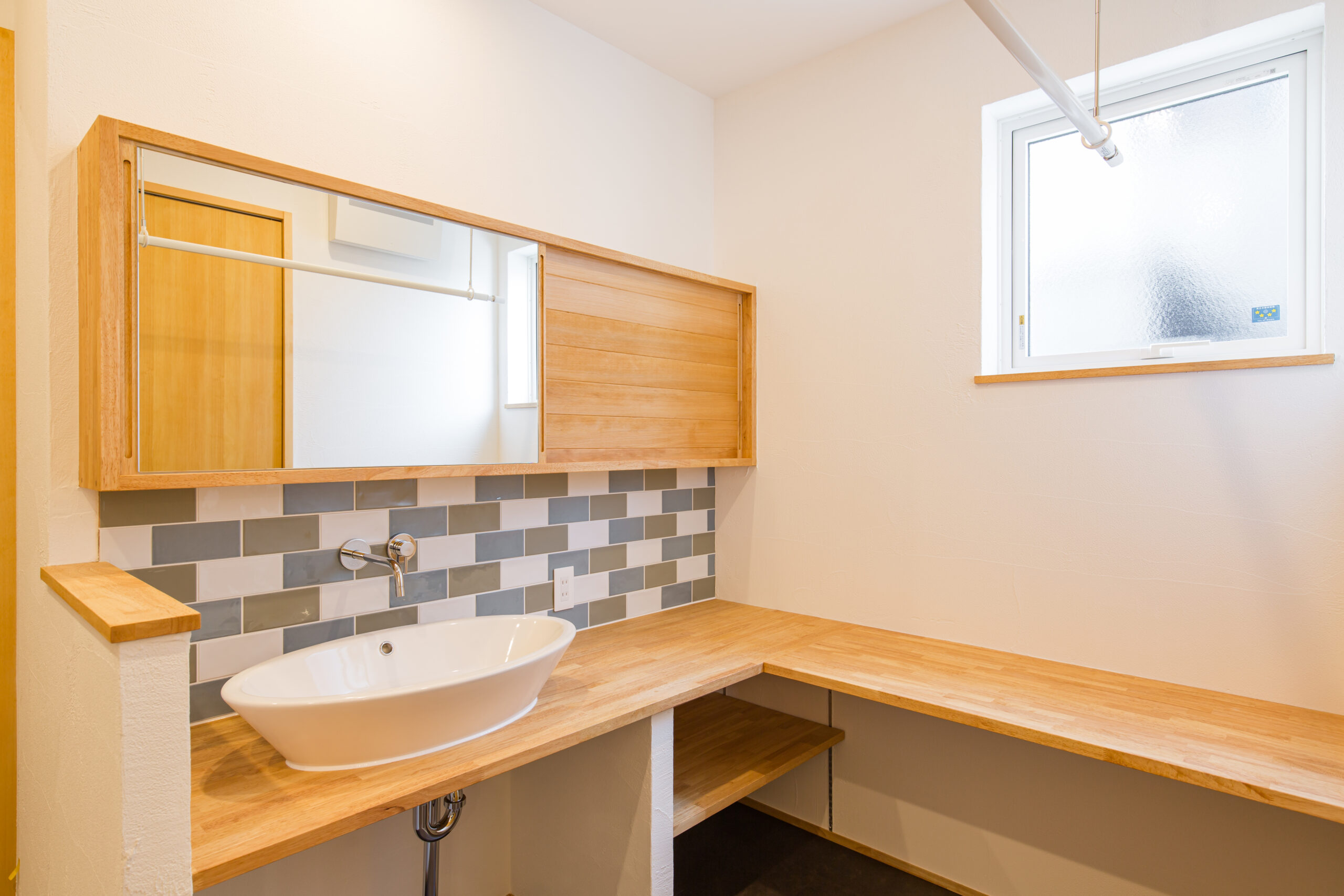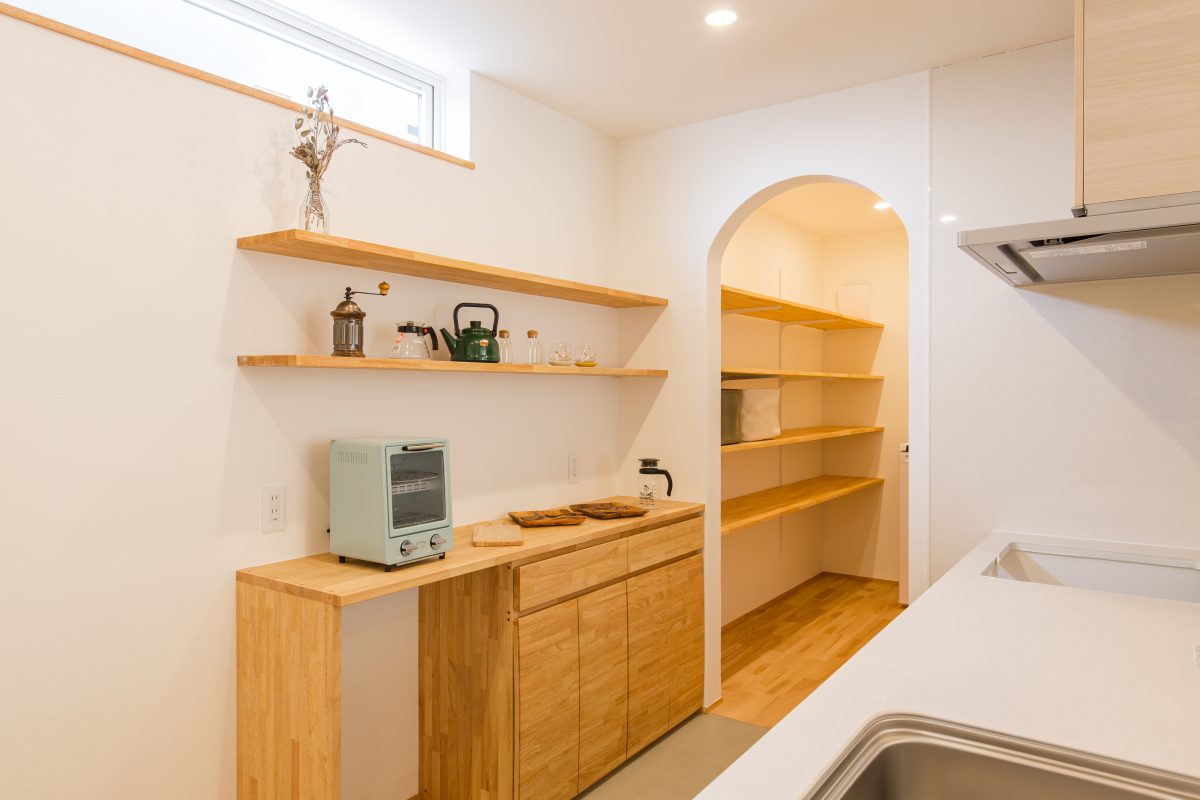アールの垂れ壁、パステルカラーのガラス玉みたいなペンダントライトなど、甘くなりすぎない“さりげなく可愛いおうち”を目指しました。