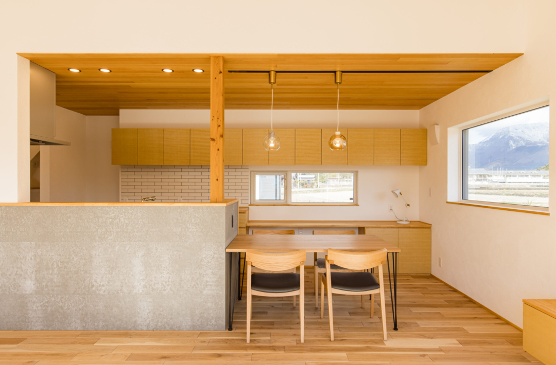 横に並んだキッチンとテーブルの上部は、板張りの下がり天井に。漆喰の白と木目のコントラストがとてもさわやか。造作キッチンボードとの相性もばっちりです。